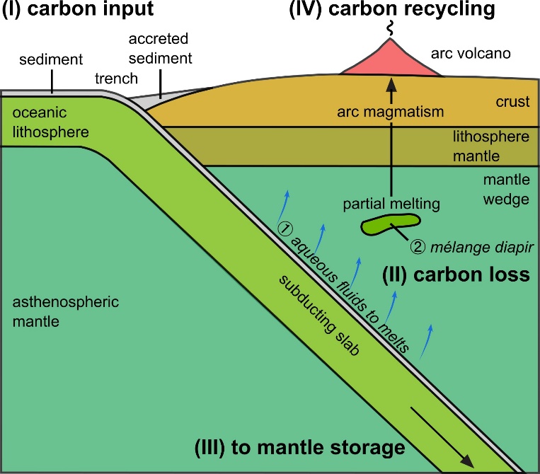 圖1. 以深部碳循環(huán)為視角的俯沖帶示意圖。碳通過多種途徑參與深部循環(huán):(I)沉積巖和大洋巖石圈(即地殼和巖石圈地幔)巖石向俯沖帶輸入碳。(II)在俯沖過程中,碳通過脫揮發(fā)分作用、溶解及部分熔融等方式從俯沖板塊中釋放。(III)部分碳被進一步帶入地幔深處并儲存;(IV)一部分碳通過弧火山作用重新返回地表。需要注意的是,俯沖板片中碳的釋放可以用兩種端元模式來解釋。①傳統(tǒng)模式:認為俯沖板塊釋放的流體和熔體導致地幔楔發(fā)生部分熔融,從而產生弧巖漿;②混雜巖(mélange)模式:認為俯沖板塊的沉積物、蝕變洋殼和水化的地幔物理混合形成的混合巖,以底辟(diapirs)的形式上升到地幔楔,熔化后產生弧巖漿。