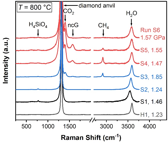 圖2. 比較純H2O(H1實驗)、SiO2-H2O(S1實驗)和SiO2-COH(S2-6實驗)體系在800 ℃和約1.5 GPa下超過一小時的含水流體拉曼光譜。請注意,光譜的基線已校正,強度已根據(jù)近3600 cm-1處的H2O峰高進行了歸一化處理。