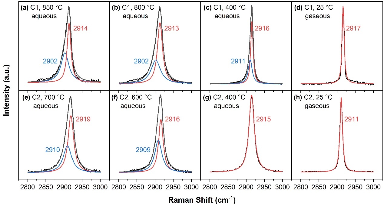 圖 3 2800-3000?cm-1波長區(qū)域內從高溫到低溫還原的含CH4的含水流體和氣相的拉曼光譜擬合結果。在C1實驗中,鋯石被用作壓標。800和850 ℃的拉曼光譜是在加熱過程中收集的,而400和25 ℃的光譜則是在達到最高溫度后冷卻過程中獲得的。在C2實驗中,沒有使用壓標,以消除潛在的硅酸鹽干擾。600和700 ℃的拉曼光譜是在加熱過程中采集的,而400和25 ℃的拉曼光譜是在達到最高溫度后冷卻過程中采集的。請注意,紅色曲線表示擬合的CH4主峰,藍色曲線表示擬合的肩峰。